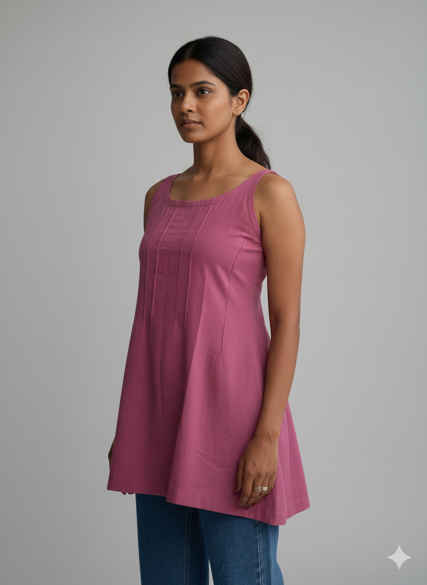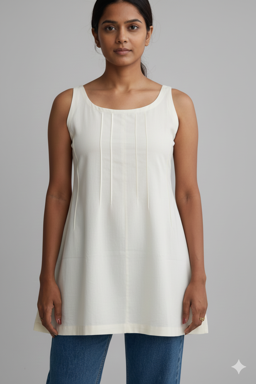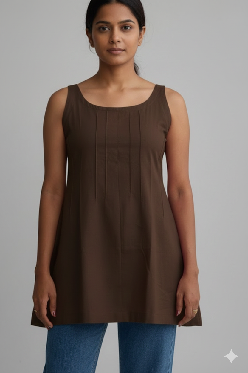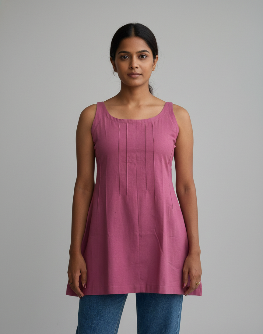 Elevate your everyday wardrobe with our Sleeveless Pintuck Tunic, a perfect blend of understated elegance and modern comfort. Crafted from a premium, breathable cotton-rich fabric, this piece is designed to transition seamlessly from a casual morning coffee to a relaxed office environment.